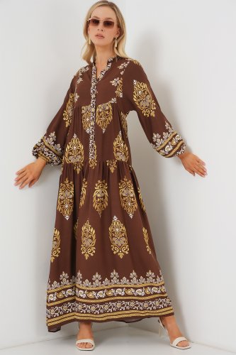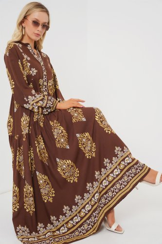 • 2423 Otantik Desenli Tesettür Elbise Beyaz Kahve