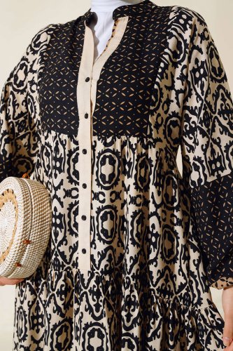 Siyah Krem Desenli Viskon Tesettür Elbise 2423