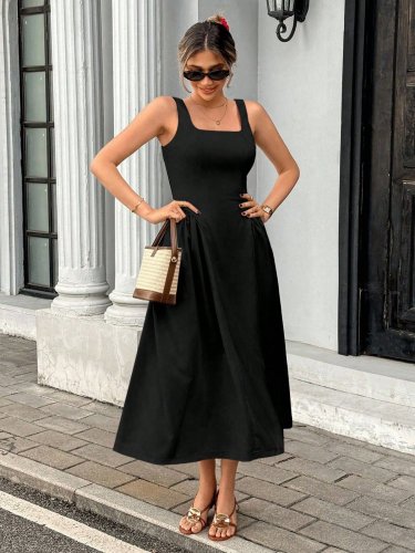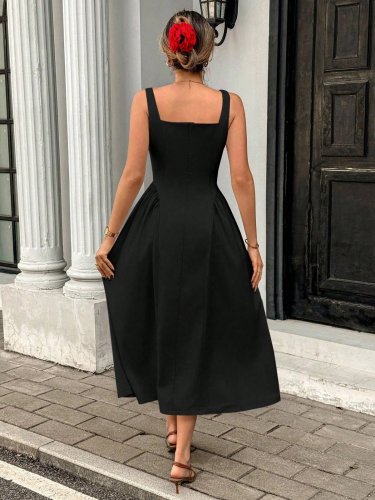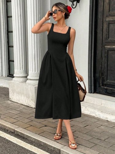 • Kadın askılı kare yakalı uzun ithal krep elbise